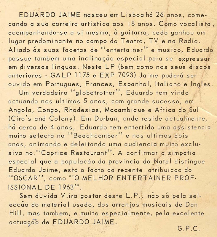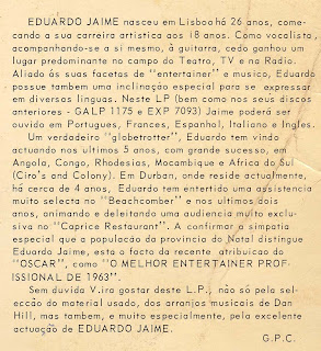 Eduardo Jaime nasceu em Lisboa, corria o ano de 1935. Começou a cantar aos 18 anos, acompanhando-se sozinho à guitarra e ganhando rapidamente notoriedade, primeiro na rádio e depois na televisão, sobretudo junto do público feminino. Em 1959 surgiu o primeiro contrato para África, onde começou por actuar em diversos teatros e night-clubs de Angola, Congo Belga e Rodésia. Nos finais desse mesmo ano chega a Moçambique, onde, em Lourenço Marques e durante cerca de 6 meses, realiza um programa no Rádio Clube de Moçambique, patrocinado pela Colgate-Palmolive, com a qual assina um contrato de exclusividade. Na vizinha África do Sul actua nos famosos “Colony” e “Ciro’s” de Johannesburg e no “Beachcomber” de Durban, onde chega a gravar um album ao vivo com o quarteto vocal The Sparklers, em 1961. Durante a década de 60 continua a gravar discos e a fazer actuações na África do Sul com o seu Eduardo Jaime Trio, dividindo-se entre boites de hoteis de Durban (como o “Causery” do Edward Hotel) e Johannesburg (no Langham Hotel). Para além de fazer a maior parte dos arranjos musicais dos discos que foi editando ao longo dos anos, Eduardo Jaime sempre teve também o hábito de interpretar as suas canções em variadissimas línguas: Espanhol, Francês, Italiano, Inglês, Grego, para além do português.