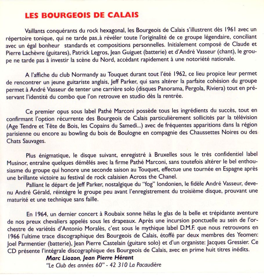 - 1962 - Enregistrement d'une maquette de 8 titres, André Vasseur quitte les Bourgeois de Calais pour s'essayer à une carrière solo;