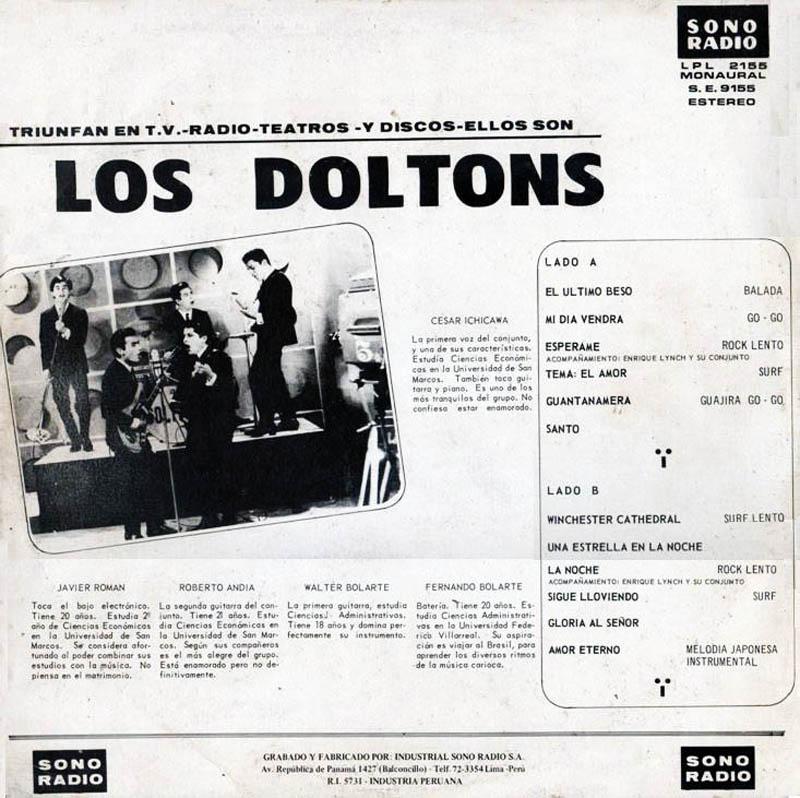 Los Doltons - Grupo peruana formada por los años 1965, en la época de la Nueva Ola. Formado en el distrito de Breña, en Lima. Walter Bolarte fue el iniciador de esta banda, ya que comenzó a unir a algunos conocidos que sabían de música. Se dice que Walter anduvo caminando por las calles de Breña, hasta escuchar en un jardín tocando varios temas; Walter pidió una guitarra y se les unió a esa tocada. Desde ese día comenzaron a tocar desde valses hasta rock. Estos músicos eran Roberto Andia y Javier Román. Y así iniciaron tocando en fiestas particulares y amenizando reuniones. En 1966, el grupo se pone a ensayar en los estudios de “EL Show de Sergio” ( transmitido por el Canal 2 y conducido por Sergio Vergara). Es allí donde conocen a Gerardo Manuel, y lo invitan a participar en su grupo. El nombre de Los Doltons lo puso Gerardo Manuel, esto se debe a que en Ica ( tierra natal de Gerardo Manuel Rojas), tuvo Gerardo su primer grupo llamado “Los Doltons”, y además, el sello en donde graban el grupo The Ventures era “dolton”. Gerardo Manuel seria reemplazado por Cesar Ichikawa ( le motivo fue la vocalización del ingles), cantante de ascendencia japonesa, la cual le dio la popularidad. Gerardo Manuel Rojas, nunca dejo un material grabado con Los Doltons. Gerardo Manuel emigra a otra banda “ Los Shains”. Desde ese momento siempre una rivalidad entre Los Doltons y Los Shains, pero solo una rivalidad amistosa. En su primer 45 rpm se incluyó el tema “Visión de Otoño” y “Rey Tablista”, la cual causó una gran acogida en el Perú. Este EP, fue gracias a la ayuda de Mario Cavagnaro, director de “Radio Sono” en ese entonces. Gracias a este primer disco fueron artistas exclusivos en Panamericana Televisión. En sus inicios interpretaban cover’s, que gracias a ello, se hicieron conocido en todo el Perú y en Latinoamérica. Cabe resaltar que su productor fue el músico argentino Enrique Lynch. Posteriormente sacan su primer disco, con canciones como “Nila”, “La Ventana”, etc. Graban su primer LP 33 rpm con temas como “Amarrado”, “Nadie Me Puede Juzgar” , etc. Sus canciones mas exitosas fueron “EL Ultimo Beso” cover de “Last Kiss”. Grabaron mas de siete Long Play y varios discos de 45 rpm. En 1967, la revista Billboard los nombró como mejor agrupación latina de ese año. La banda se retiró en 1970 por mutuo acuerdo y a causa de sus estudios universitarios. Cesar Ichikawa parte a EEUU por motivos laborales. En 1975 deciden juntarse para grabar un Lp. Esto se debe a que los discos de 33 rpm estaban siendo muy aclamadas por todos los admiradores del país, y es así que se acuerda en sacar un LP mas de Los Doltons. Fue muy duro la búsqueda de los integrantes, ya que Cesar estaba en EEUU, mientras que los otros ejercían sus profesiones. Este LP fue titulado “El Retorno de Los Doltons”, bajo la dirección y arreglos de Rulli Rendo, la cual este marcaría el final del conjunto original.