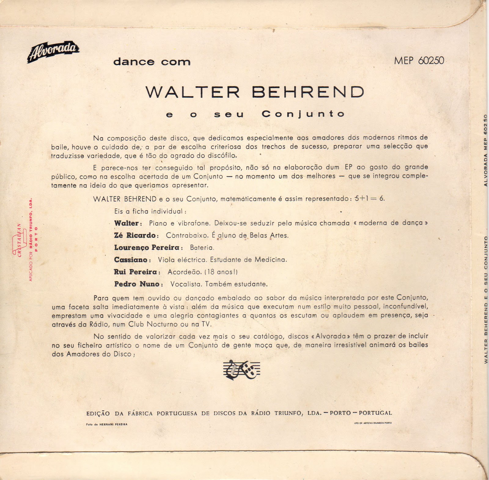 segunda-feira, 23 de maio de 2011Mais um ótimo EP deste grupo quase desconhecido.Um disco cheio de ritmo, próprio da época. Walter Behrend e o seu conjunto foi considerado desde o seu início, como um dos primeiros grupos portugueses a estrear-se no rock em Portugal.