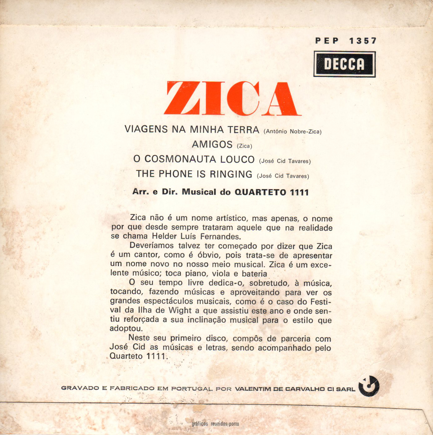 Da contracapa do EP transcrevemos: "Zica não é um nome artístico, mas apenas o nome por que desde sempre trataram aquele que na realidade se chama Helder Luís Fernandes.
